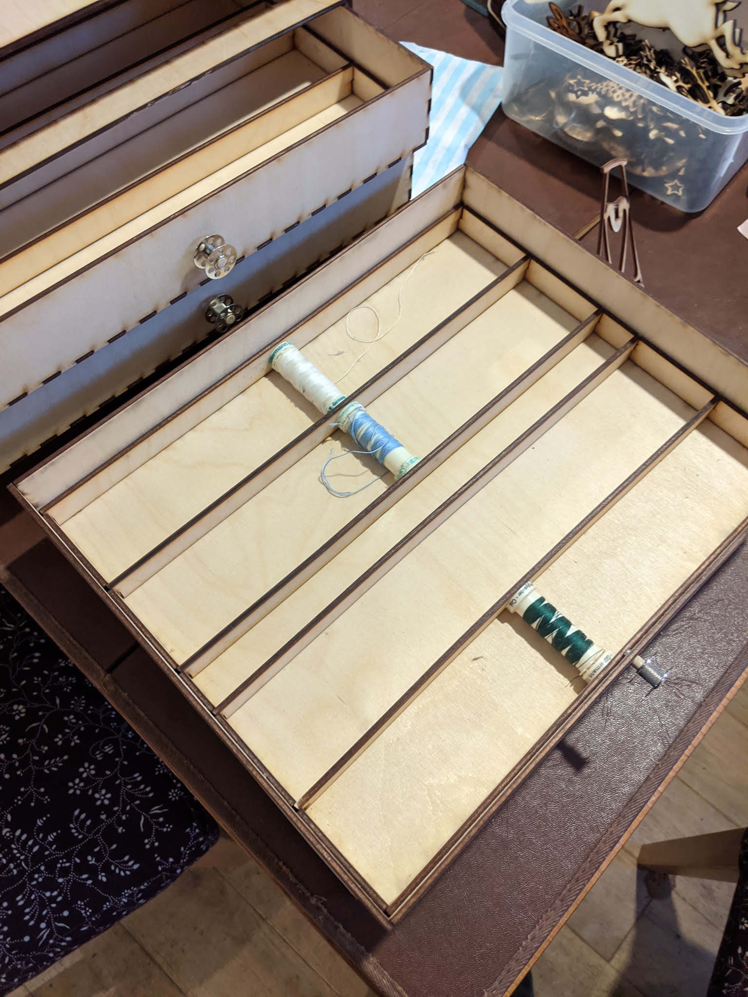A set of four drawers in birch ply using spare cotton bobbins for the drawer handles.